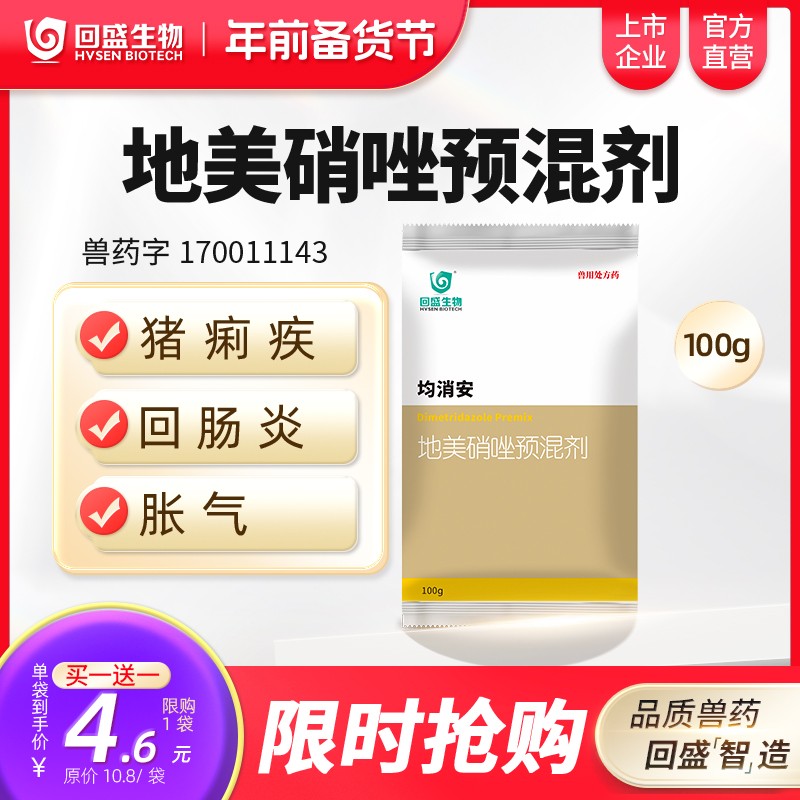 - 商品名称:【回盛生物】#均消安100g/500g20%地美硝唑预混剂 顽固腹泻肠炎痢疾魏氏梭菌禽滴虫病抗驱原虫