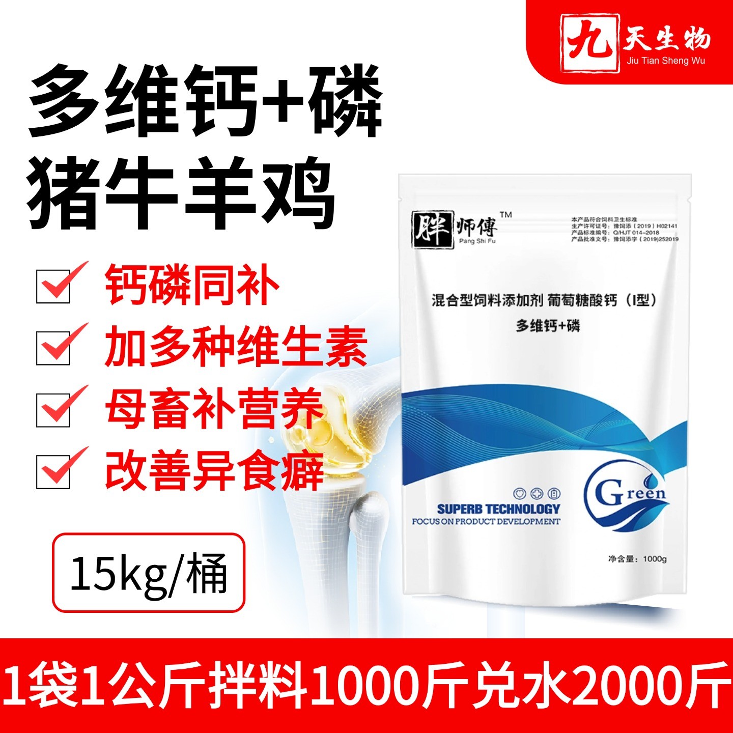 商品名称:【九天生物】多维钙+磷15袋/件,钙磷十八补多维多种维生素补充微量元素促生长异食癖吃土牛羊猪用 商品编号:19623 品牌:河南九天生物科技有限公司 上架时间:2022-04-13 商品净重:15.000千克 使用方法:一袋拌料1000斤,饮水2000斤 质保期:18个月