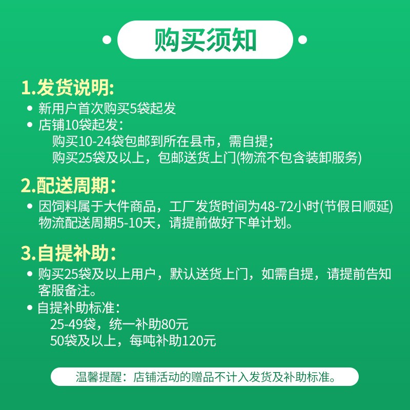 管理员:新希望畅消520预混料购10包-24包可包邮到县城, 单笔购满25包以上(赠品数量不计入)可以直接送货到家。