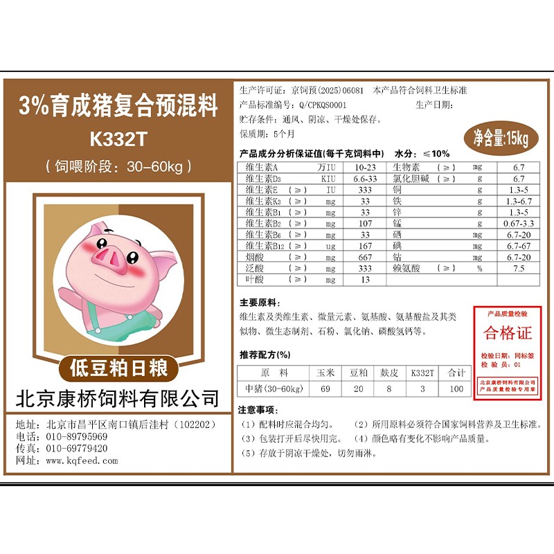 - 商品名称:【康桥饲料】3%低豆粕中猪预混料 15公斤包装 中猪料 肥猪料 适合猪价低迷